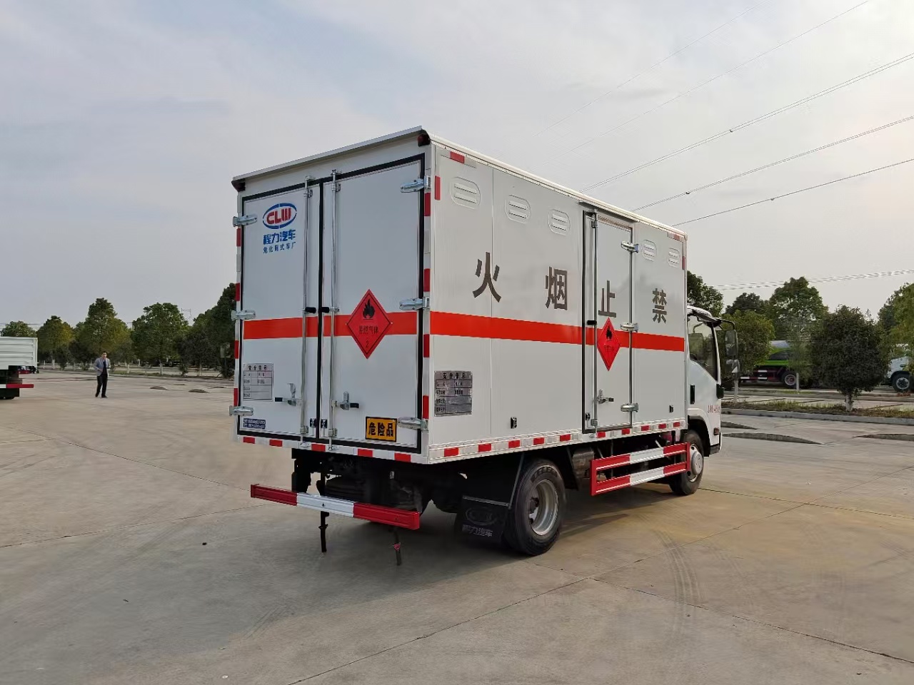 貨箱配置 廂體為雙層金屬骨架結構,外板采用冷軋鋼板,中間填充阻燃泡沫,內飾為鋁板。底板為平板上鋪防靜電膠皮。廂內兩側加裝固定貨物臥環,門框帶防盜報警器,頂部帶煙霧報警器,廂體右側選裝側門,隨車配2個滅火器,危險標志牌,防火帽,危險品三角頂燈。(選裝瓦楞板貨箱) (尾部可選裝液壓升降尾板)