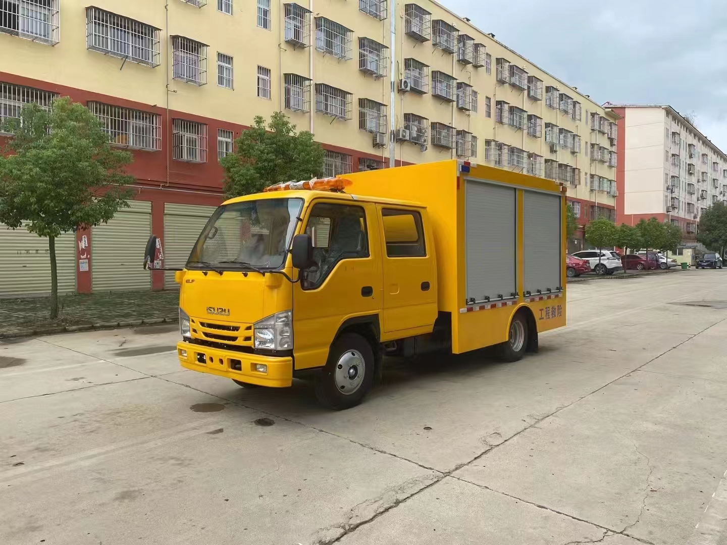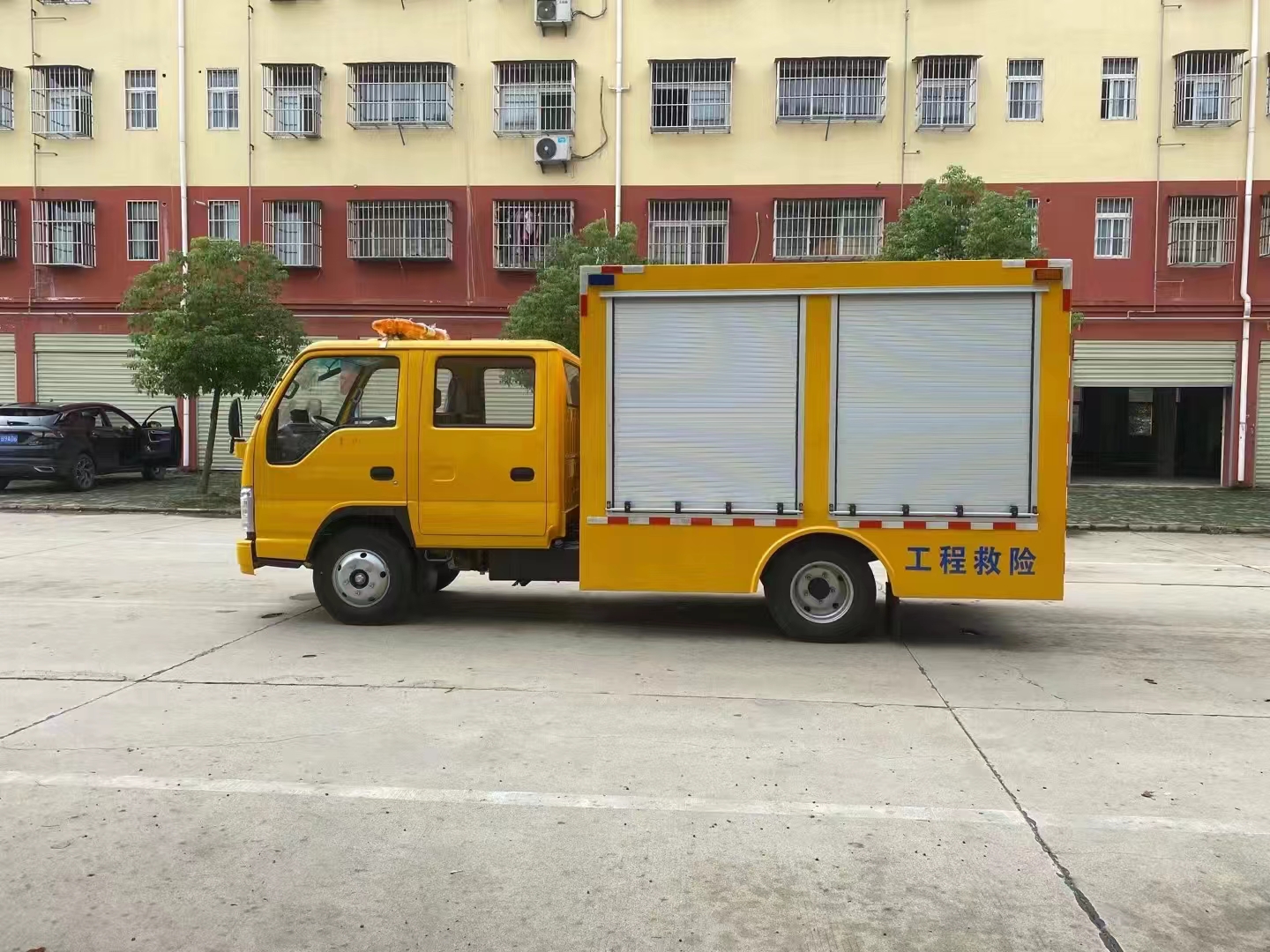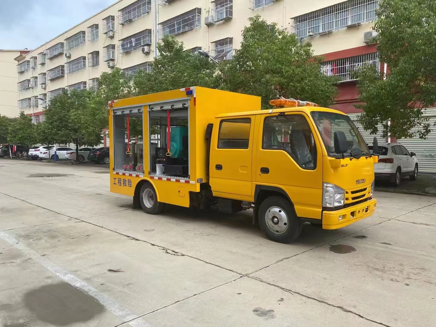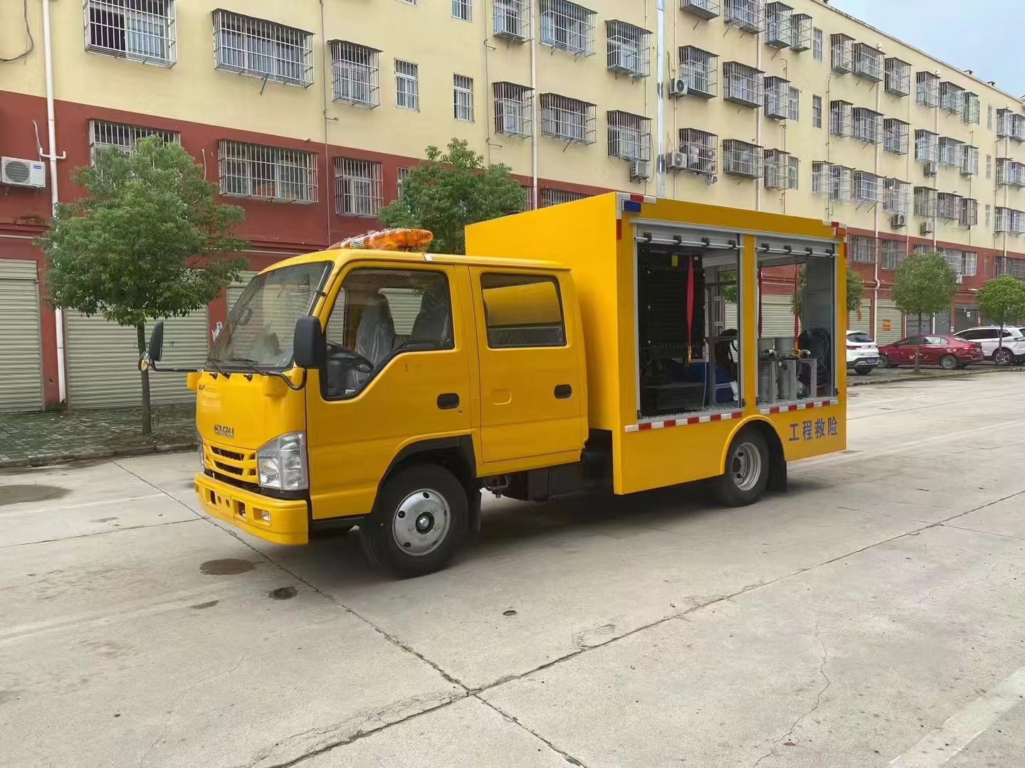 上裝配置  車箱一體式全封閉車箱車箱有隔音功能,廂體防火,阻燃,防雨,防塵,防銹,降噪,隔震,長期抗震結構,廂體外觀按照公告外觀制作,左右卷簾門,尾部是卷簾門,廂內安裝LED作業燈,作業燈帶獨立開關,底板采用花紋板。配備康明斯50KW發電機組,2臺功率22KW便攜式超輕型高速潛水泵,單臺水泵流量可達500m³/h,單泵配40米排水管(20米/根),水管直徑 DN200mm,水管材質為滌綸長絲編織。配有升降照明燈,升降燈可通過無線和有線遙控兩種方式控制,升降燈升降高度為1.2米,可水平旋轉。帶接地樁和接地電纜線,便攜泵控制柜,潛水泵浮圈,長排警燈,倒車影像,配兩只手提式干粉滅火器2只。其余為標配…